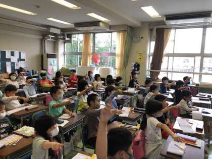 3年生の1学期分の新出漢字もいよいよ終盤に入ってきました。お手本役の子の空書きに合わせてみんなも元気よく指を動かしていました。習った漢字が日に日に増えていき、身に付けるのも大変ですが、身の回りで使われている漢字から習った漢字を見つけて見たり、日頃から本を読んだりしながら、漢字に慣れ親しんでいけるとよいですね。