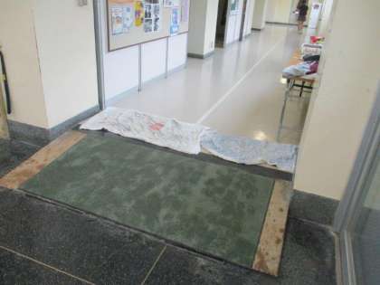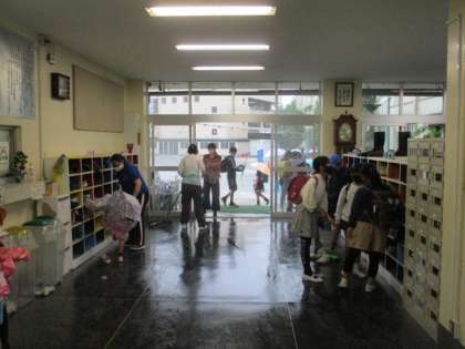 昨日から雨の中での登校が続いています。子どもからは、「おはようございます」のあいさつとともに、「もう、雨はイヤだ!」という声も聞かれます。雨の時は、滑らないように主事さんが濡れているところをはいてくれたり、足拭きのタオルを準備してくれたりします。