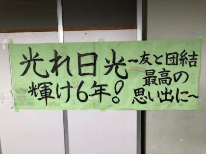 6年生教室の近くに、日光林間学園に向けてのスローガンの横断幕が掲示されました。各クラスで話し合った内容を実行委員が持ち寄りスローガンを決めました。みんなの思いが込められたスローガンになりました。「友と団結」「最高の思い出」すてきな言葉です。