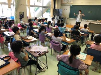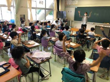 1年4組の音楽の様子です。大きな声で合唱という訳にはいきませんが、歌に合わせた振付を元気よくがんばっていました。みんなで動きがそろうととてもうれしそうな笑顔を見せていました。「副校長先生もやってみてよ」と、優しく振付を教えてくれました。
