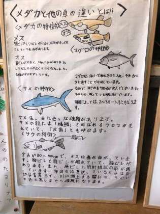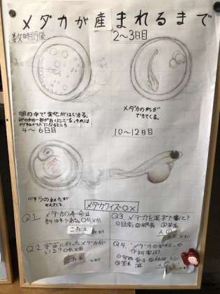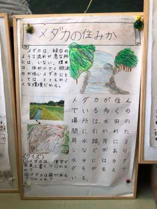 5年生の理科でメダカについて学んできたことやそれぞれが課題を見つけて調べたことを、写真のように模造紙にまとめました。教科書の内容をさらに発展させたものばかりです。興味深いテーマ設定やまとめ方のわかりやすさにとても感心しました。