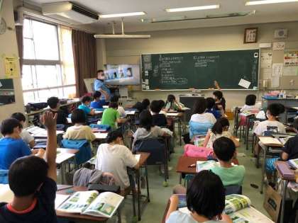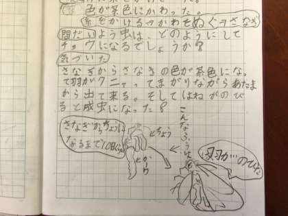 今日の時間では「幼虫はどのようにしてチョウになるのだろう」について考えました。3−3の教室で飼育を始めたモンシロチョウの卵は今、幼虫になり、さなぎになっているものもあります。間近で観察してきた経験での気付きや資料を基に、分かったことを整理しどのようにしてチョウになるのかをまとめていきました。さなぎからチョウになるまでの期間は約10日間だと分かり、教室のさなぎが間もなくチョウになることを楽しみにしていました。