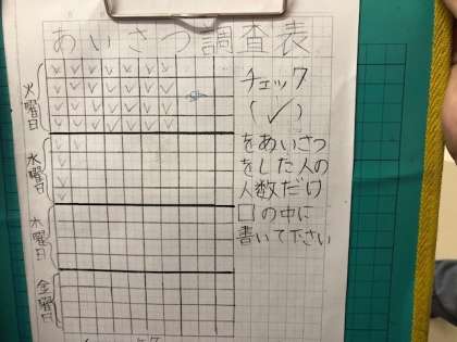 今日から、代表委員よる「あいさつ調査」が始まりました。明正小の挨拶の現状を把握するための物です。朝、東昇降口の1〜3年生に代表委員の児童が元気に挨拶をしていました。その挨拶に対してどれくらい元気な挨拶が返ってくるかを表にまとめていました。この調査から明正小の挨拶の現状をどのように分析し、どのような働きかけが発信されるのかとても楽しみです。