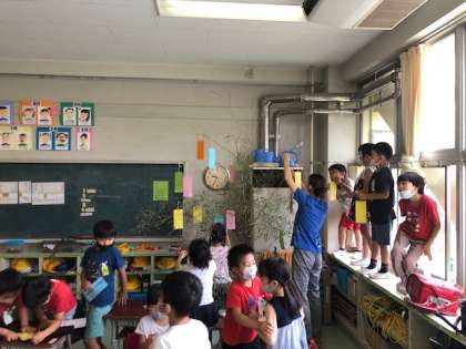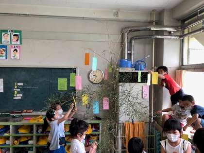 7月7日は七夕です。昨日の放課後、1年担任は里山に笹を取りに行きました。各クラスで、短冊に願い事を書いて教室に飾りました。「びょういんのせんせいになりたい」「こうきゅうなホテルでおとまりしたい」など、たくさんの願い事が笹に飾られました。今日は雲が多く、星を眺めるのは難しそうですが、子どもたちの願い事が叶いますよう空を見上げたいと思います。
