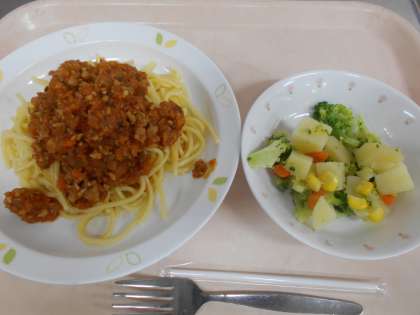 ヘルシーミートソーススパゲティ マセドアンサラダ 牛乳