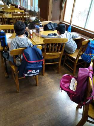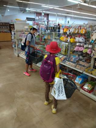 お土産を買いました。誰にどんなお土産を買うか、じっくり考えています。レストランを借りてお弁当を食べました。