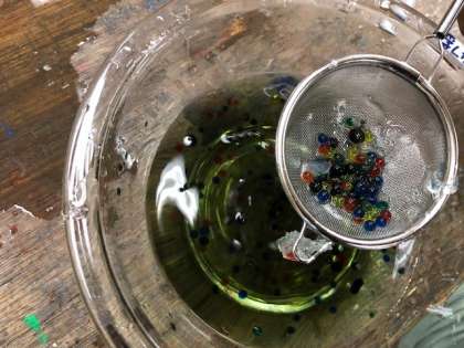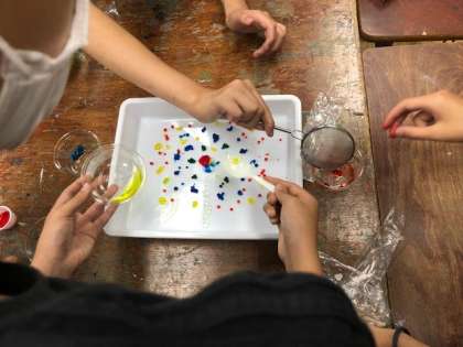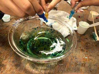 6年生の図工は「イクラでアート」・・・何とも魅力的な題材名です。アルギン酸ナトリウムと乳酸カルシウムという薬品と水、色素を混ぜて原液を作り、その液体をスポイトで吸い上げ、水にポタポタとたらします。そうするとあら不思議、イクラのような粒々の物が出来上がります。イクラに見立てたそれらを使ってアートにします。とても楽しそうでした。