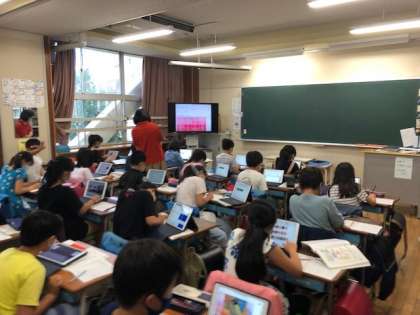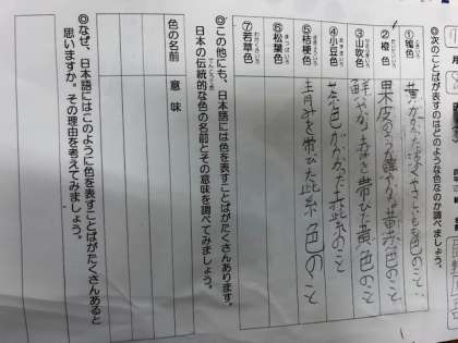 4年生の日本語はタブレットを使って調べ物をしていました。何を調べてたかというと色の種類を表す日本語についてです。あるサイトによると日本語には713種類もの色を表す言葉があるそうです。鴇色(ときいろ)桔梗色(ききょういろ)松葉色(まつばいろ)などなど、聞いただけではどんな色なのか分かりません。子どもたちは意欲的に調べ、日本語の豊かさを感じ取っていました。