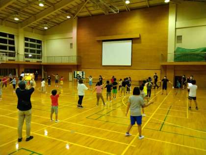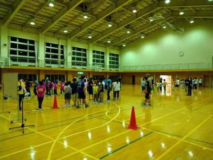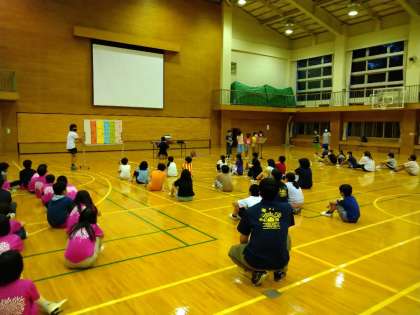 子ども会が終わりました。明正小の進行で行いました。明正小のクイズはおお盛り上がりでした。他にも、しっぽ取りやダンスで楽しみました。これから就寝の準備です。
