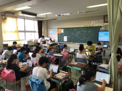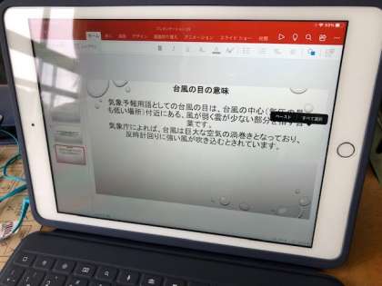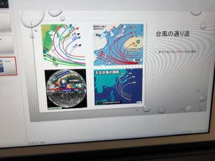 5年生の理科では台風についてタブレットで調べ、プレゼンテーションソフトを使って調べたことをまとめていました。世界の国々の中でも日本には台風が上陸する回数がとても多いことや、台風のでき方、台風の進路など必要な情報を選びながらまとめていました。完成したらロイロノートで提出するようです。タブレットの活用が進んでいます。