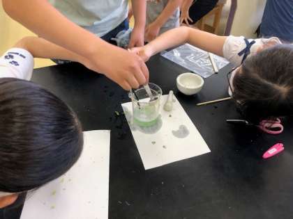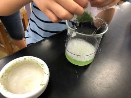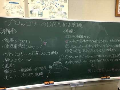 科学クラブでは、ブロッコリーのDNAを抽出するという実験を行っていました。食塩、食器用洗剤、無水エタノールを使用して行いました。すりつぶしたブロッコリーと食塩と食器用洗剤と水で創った液体を混ぜ、5分程おいておきます。その後ろ過してエタノールを注ぐと白い物が出てきました。ブロッコリーのDNAです。写真に収めたつもりがピントがずれた写真しか残っておらず、公開できず残念です。子どもたちはとても楽しそうでした。