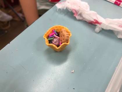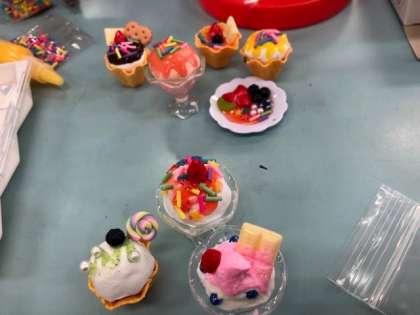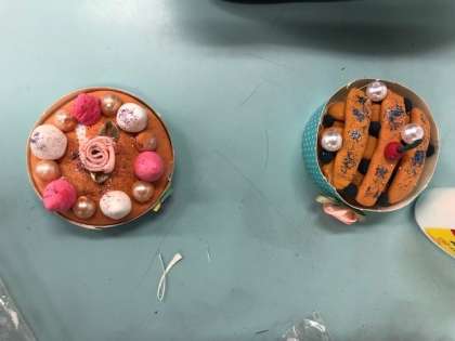 紙粘土で作った「スイーツ」にデコレーションを施していきます。とてもかわいらしい作品がたくさんできていました。本物のスイーツと見間違いそうなほど完成度の高い作品ばかりでした。