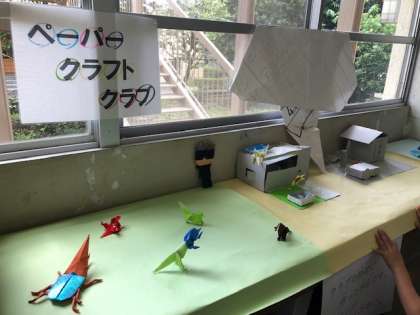 ペーパークラフトクラブの作品も、職員室前に展示しています。折り紙で作った恐竜や昆虫、工作用紙で作ったお家など、平面だった紙がクラブ児童の手によって立体作品に変身しました。