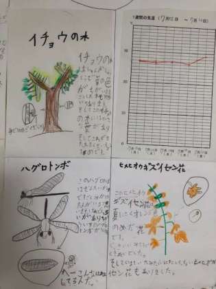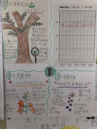4年生では春の季節新聞に続いて、夏の季節新聞も作成し完成しました。春に決めた「自分の木」の夏の様子を観察して気付いたことや春には見られなかった植物のことについて記事にしてまとめました。気温図からは春との明らかな違いに気付いたことでしょう。その気温の違いと植物の生態の違いとを関連付けて考えることによって、科学的なものの見方や考え方が磨かれていくのですね。