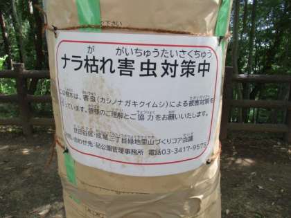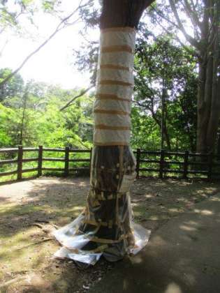 今、写真のように、木の幹にシートを巻き、幹から出てきた「カシノナガキクイムシ」が他の木に行かないようにしているそうです。大事な里山の木々が元気を取り戻してくれるといいですね