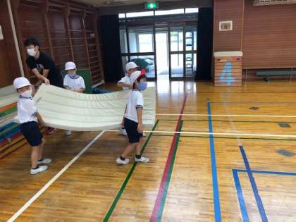 クラスが半分の人数になるので、1年4組5組は体育館で合同体育をしました。マットを使った運動遊びです。まずはマットの安全な運び方を学習しました。その後は、「わに」「カエル」などいろんな動物歩きをしました。広々と体育館を使用し、マットの運動遊びを楽しみました。
