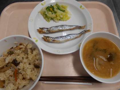 しめじごはん 焼きシシャモ 野菜の菊花あえ じゃがいものみそ汁 牛乳
