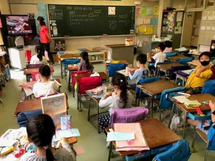1年生の図工では、お家からいろいろな箱を持ち寄って工作をしていました。箱の形を生かした飾りを付けながら貯金箱やお家、生き物など思い思いの作品作りを楽しんでいました。Teamsで自宅から作品紹介をして、お友達の作品を鑑賞していました。画面の向こうで張り切って紹介している姿がとてもかわいらしく映りました。