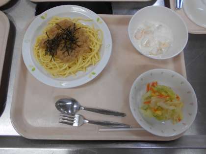 おろしスパゲティ コーンサラダ フルーツヨーグルト 牛乳