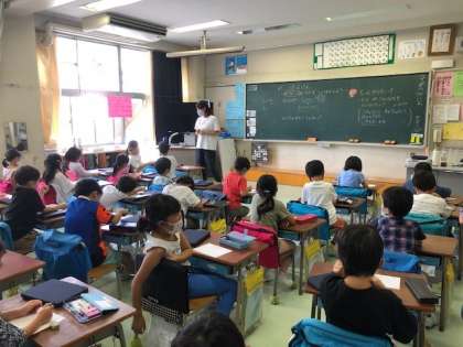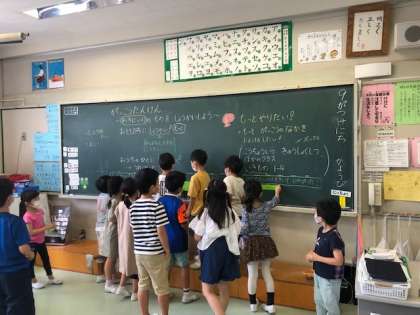 1年生の生活科では学校探検で撮影してきたお気に入りのもの、場所を紹介し合う活動を行いました。5年生が飼育しているカメや行事で使う「くす玉」の写真など、校内で見つけてきたお気に入りを見せながら感想を伝え合いました。この活動を通し。子どもたちの「もっと〜したい」という気持ちが膨らんだようでした。「次は校長室に行って写真を撮りたい」「給食室も見てみたい」など今後の活動への意欲を「やりたいカード」に書くことができました。