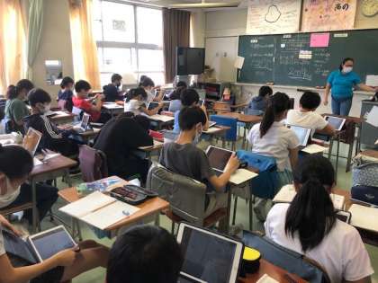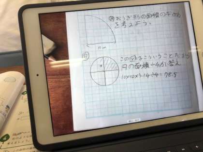 6年生の算数では、円の面積の求め方を基にして「おうぎ形」の面積の求め方を考えました。自分の考えをノートに書いた後は、ロイロノートで考え方を共有しました。考え方は同じでも表現の仕方は人それぞれのため、どの子も興味深く画面を見て理解しようとしていました。後半は発展問題にもチャレンジしました。これまで学んだこととの共通点を見付けたり、これまでと同じ考え方を利用したりすることで、発展的な問題も解くことができることを確認しました。