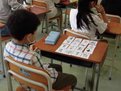 教師の読み上げるカードにみんな集中します。カードは単に物の名前を表しているものではなく、「The red bird reading a book」など、複雑な表現のものもあります。持ち札の中にカードを見つけて、「あった。」と声が上がりました。「Repeat after me.」に続けて英文の復唱にもしっかり取り組んでいました。