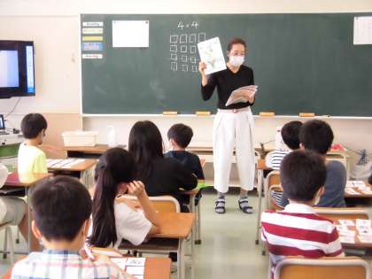 子どもたちが、教師の配った絵カードを縦4列横4列に並べ始めました。