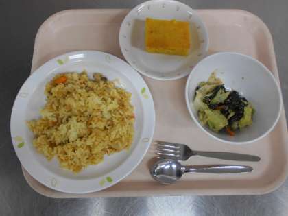 カレーピラフ、わかめサラダ、かぼちゃのケーキ、牛乳