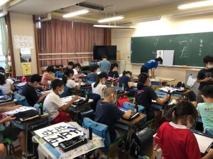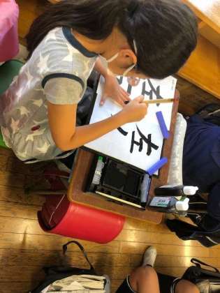 姿勢と道具を置く場所に気を配り、みんなが良い字を書こうと集中していました。筆順に気を付けると字形や筆の運び方により意識が向き、整った字になることに気が付きました。鉛筆で書く時にも意識できるとよいですね。