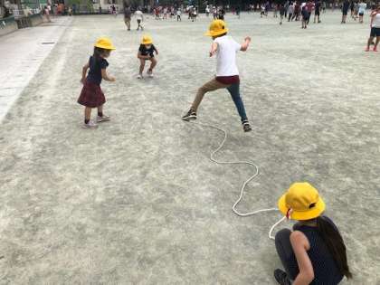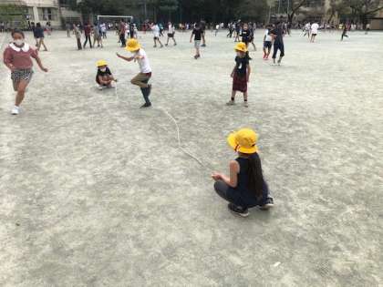 1年生が中休みに職員室に来て「先生、遊ぼう」と声を掛けてくれました。校庭に出て一緒に長縄遊びをしました。長縄を横に振って「へび」にして跳び越えたり、縦に振って「波」にして跳び越えたりして楽しく遊びました。最後は電車ごっこで校庭を1周しました。とても楽しい中休みでした。