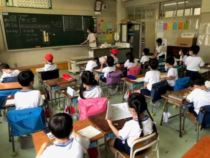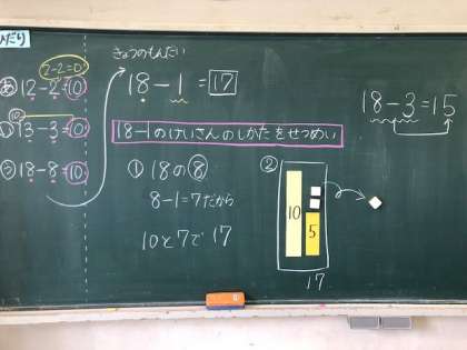 1年生の算数では「18-1はどうけいさんするか」について学習しました。答えが17だと分かるのはあっという間でしたが、どのように計算するかを考え、それを表現するのがこの時間の課題です。じっくり時間をかけて、ノートに表現しました。文で説明する子、絵を描いて説明する子、ブロック図にして説明する子など、その説明の仕方は多様に見られました。教師からの「ノートを自由帳みたいに使っていいよ」という言葉掛けに、子どもたちは安心しているように見えました。それぞれの考えを共有する時には、ノートを大画面テレビに映しました。「友達の考えを読み取ろう」との声に、熱心に画面を見つめ、友達の考えを理解しようとしていました。全員がノートに考えを書くことができていました。この時間の学習課題を全員が達成していました。
