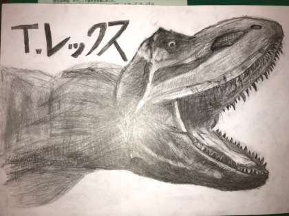 昨日、4年生が「僕が描いた絵を見て。明日持って来るから」と話し掛けてくれました。そして今日の昼休み、約束通り、その絵を見せてくれました。筋肉の筋、歯の1本1本、表情まで鉛筆で丁寧に描かれ、絵からは恐竜の叫びが聞こえてきそうでした。躍動感あふれる作品でとても驚きました。見せてくれてありがとうございました。