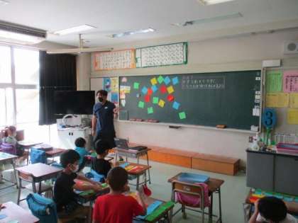 1年生は算数で「「かずをせいりして」を学習しています。ものの個数などを、絵や図などを用いて整理すると、個数の大小が分かりやすくなることを学ぶ学習です。散らばったたくさんの色紙で、一番多いものは何色か、ぱっと見て分かりやすくするためにはどうしたらいいか、一人一人の子が机の上で色紙を動かして考えました。タブレット端末で撮影して大型テレビに映し、いろいろな考えを発表しました。