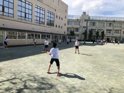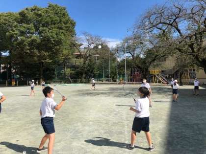夏休みに、校庭の移動式バスケットゴールを撤去したため、これまで体育館を一面使用してきたバドミントンクラブでしたが、2学期からは体育館をバスケットボールクラブと半分ずつに分けて使用することになりました。そのため、バドミントンクラブの半分は校庭に出て活動しました。少し風があり、体育館と比べて厳しい条件でしたが、子どもたちは楽しそうに活動していました。