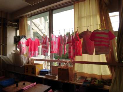 3年1組の教室に、赤く染められたTシャツが並べられていました。