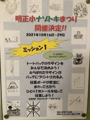 「明正小まつり」の代替イベントとしてPTA本部役員の方々を中心に「明正小ナゾトキまつり」を企画してくださいました。今週は、そのナゾトキミッションの第一弾として、トートバッグのデザイン投票を行っています。デザインは5,6年生の有志が考えてくれたものです。全部で15作品が集まりました。この15のデザインを張り付けたボードをクラスごとに回し、お気に入りのデザインにシールを貼って投票します。選ばれたデザインはトートバッグにプリントされるそうです。結果は後日、学校日記でも紹介します。