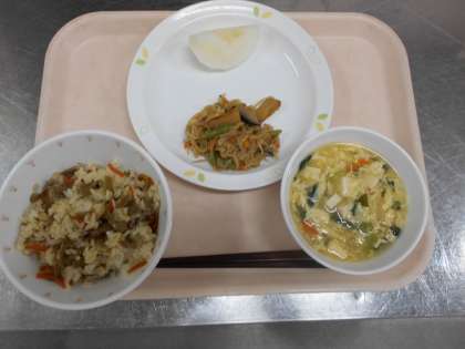 豚肉とごぼうのごはん 切干し大根の煮つけ かきたま汁 梨 牛乳
