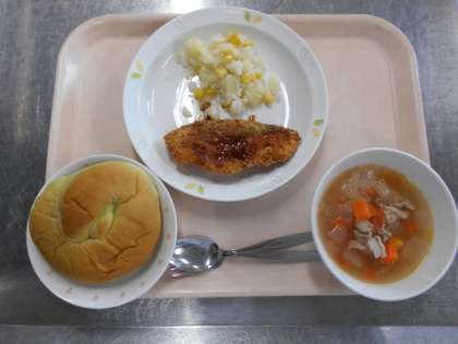 あしたばパン 鮭フライ コーンポテト ミネストローネ 牛乳
