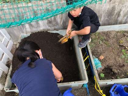 昼休み、校長室前のスペースで2年生数名がスコップで一生懸命に土をかき混ぜていました。どうやら野菜の種をまく事前準備をしていたようです。「おいしい野菜をつくるぞ」とやる気満々の2年生です。