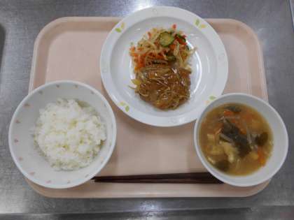 ごはん むろあじバーグ 糸寒天サラダ 大根のみそ汁 牛乳