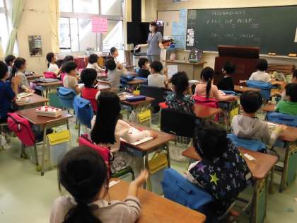 1年生の教室からみんなで手拍子をする音が聞こえてきました。リズムに合わせて担任が名前を呼ぶと、一人ずつ「はあい。」と楽しげな様子で返事をします。どの子どもも元気に答えることができました。