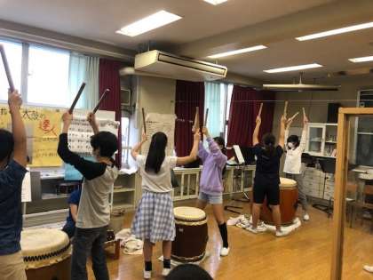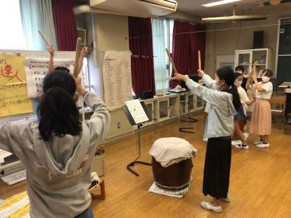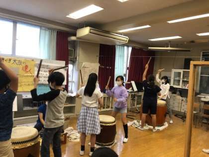 6年生の音楽では和太鼓を使って学習をしています。和太鼓に親しみながら音を合わせて演奏する心地よさ、楽しさを味わわせることがねらいです。音が大きく鳴るためタオルをかぶせて音や振動を抑えながら、安心して和太鼓を叩けるよう配慮しながら実施しています。膝を曲げ、腰を落とし、腕を高く上げて構え、バチを振り下ろします。今日は「かがやけばやし」の曲をグループごとに演奏しました。初めての児童も多い中、みんな正確に和太鼓をたたくことができていました。