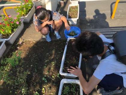 正門での元気な挨拶の横では、栽培委員会の5,6年生が鉢植えの雑草とりをしていました。「火曜日の当番なんです」と張り切って活動していました。毎日のように目にする栽培委員会の姿です。自主的な活動を継続できる力が育っています。
