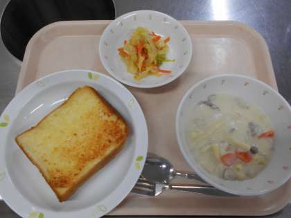 ガーリックトースト マカロニのクリーム煮 イタリアンサラダ 牛乳
