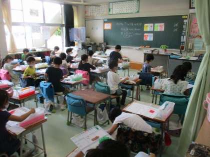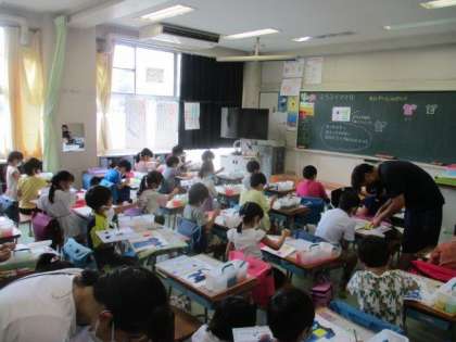 1年生が図工で絵の具を使い、「オリジナルTシャツ作り」に取り組んでいます。絵の具を使ってべた塗りしたり、線を引いたり、水玉模様にしたりといろいろな塗り方をしていました。パレットに絵の具を出し、バケツで筆をぬらし、紙に描く作業は、難しいですね。水の量で色が濃くなったり、薄くなったりもします。絵の具を使うことは、はじまったばかりです。これから少しずついろいろな方法を身に付けてほしいと思います。
