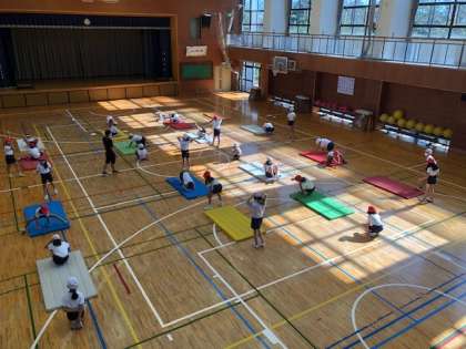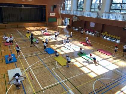 4年3組の体育「マット運動」の様子です。マット運動は、安全な準備・片付けの仕方や運動中の約束ごとを守らないとケガにつながることがあります。そして準備運動を通して技の感覚を養う運動を十分に行うことがケガの予防にもつながります。4年3組はそういった学習規律が徹底しており、感覚を育む運動を十分に行っていました。楽しく運動に取り組むために大切なことが押さええられていました。
