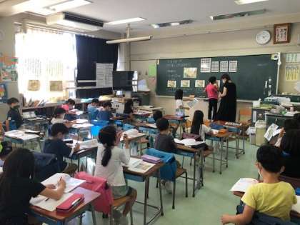 2年5組のかけ算の様子です。スイッチが縦に6列、横に4列に並んだ写真を見て、どんな式になるのかを考えていました。ノートを見ると「4×6」「6×4」「2×12」「3×8」「6×2×2」など様々な式がたてられていました。なぜその式にしたのか考え方も説明しています。友達の考え方を見て「なるほど」と納得している様子も見られました。この活動を通して、1つの事象を多面的に見たり、考えたりする算数の楽しさを味わいました。