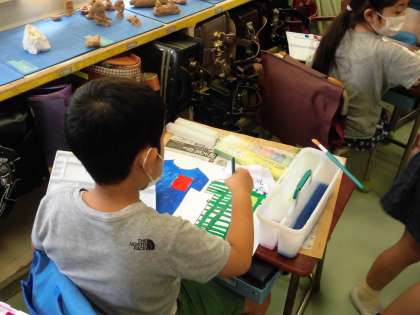 1年生が絵の具を使って、オリジナルのTシャツをデザインしていました。1枚は全部色を塗り、もう1枚には模様を描きます。
