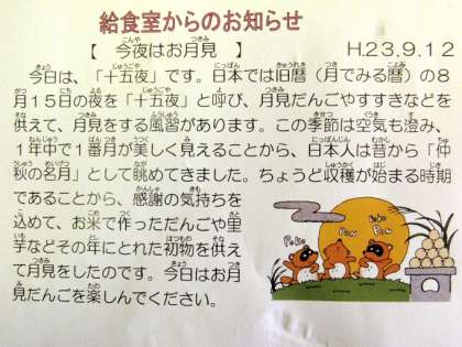 今夜は十五夜です。そこで今日の給食には、お月見団子がつきました。和風スパゲティの横に、きな粉のかかったお団子です。子どもたちは揚げパンなど、きな粉が大好きです。今夜どうやら天気もよさそうです。まんまるお月さまが見えるのが楽しみですね