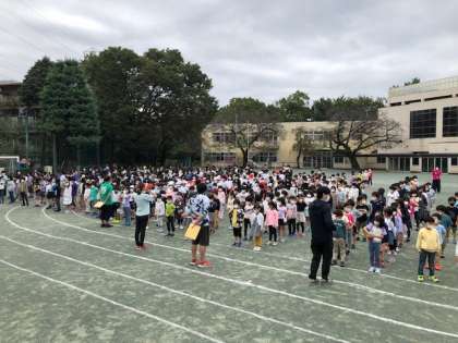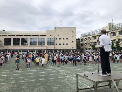 今週から全校朝会を校庭に集合して実施することにしました。1学期の始業式以来の全児童集合です。みんなで集まれる、それだけでワクワクする気持ちになりました。前後の間隔を十分にあけて整列しました。引き続き、感染状況を見ながら朝会、集会等の実施形態を判断してまいります。
